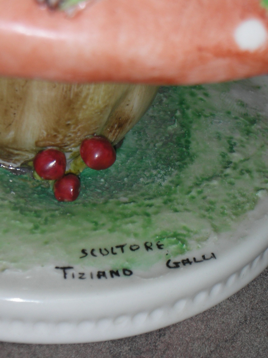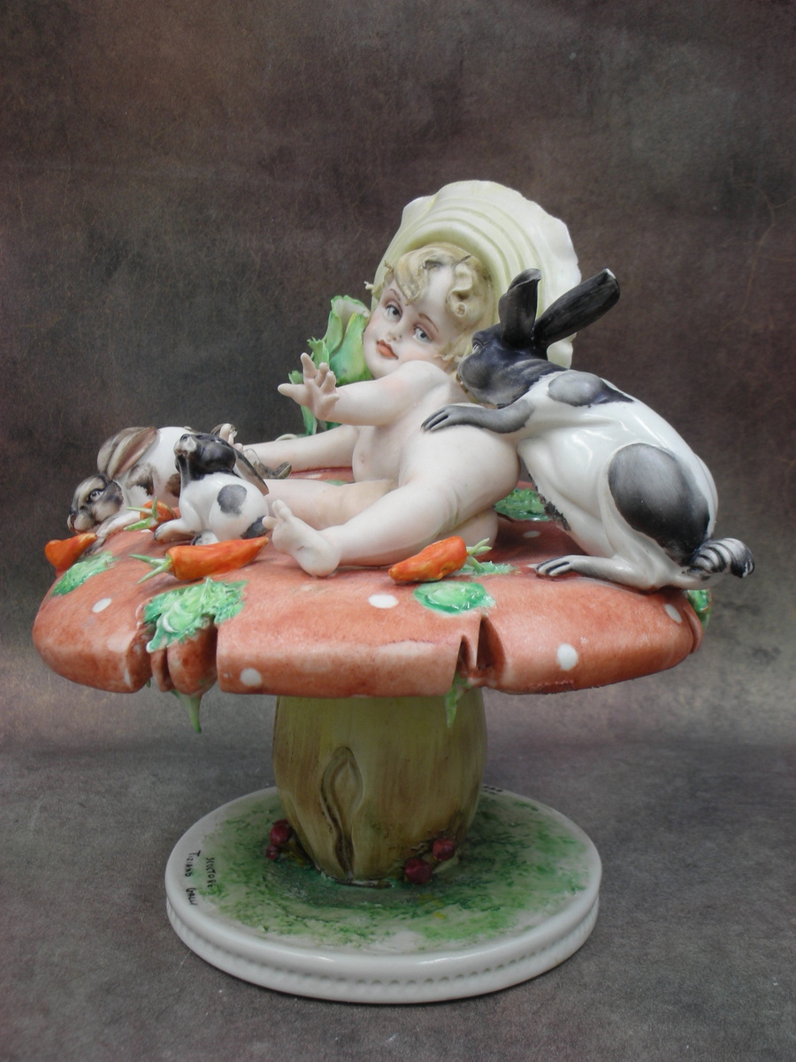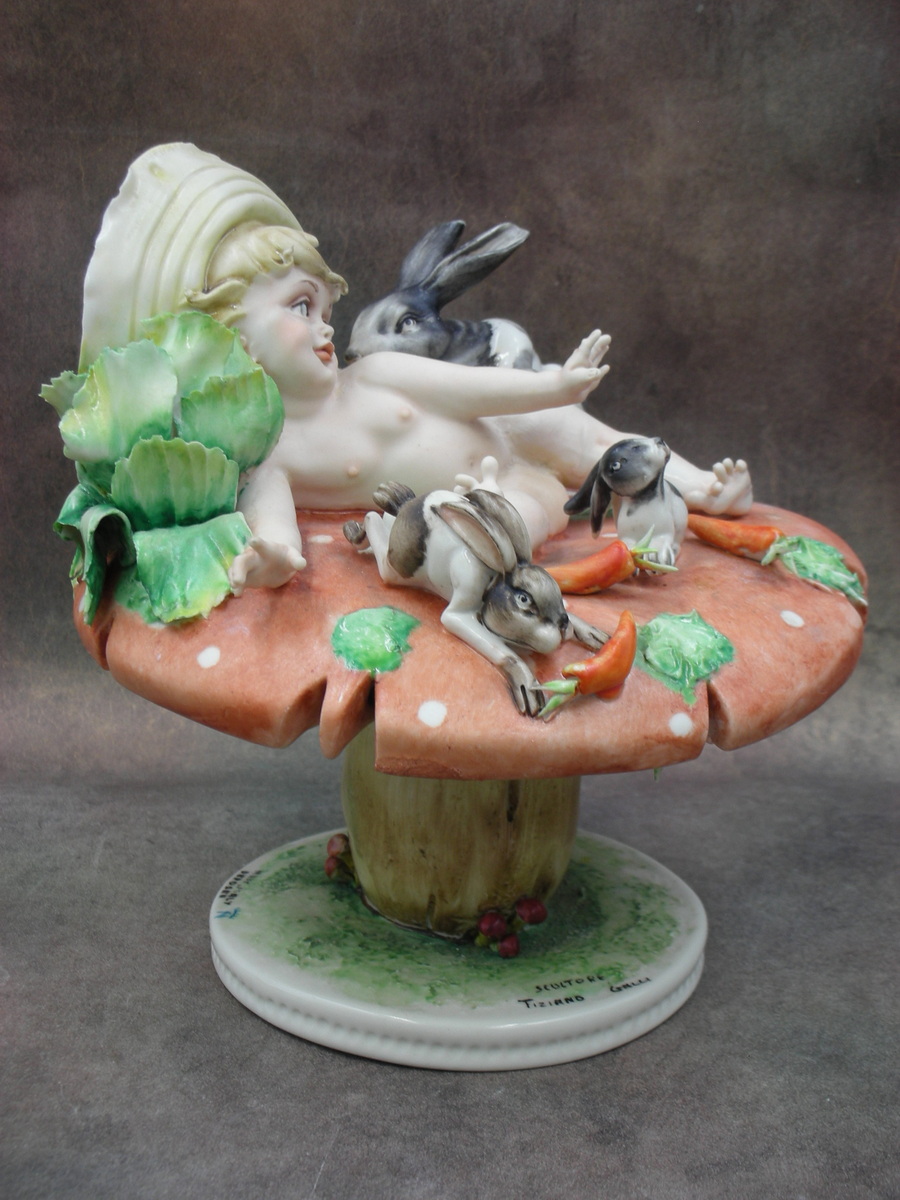 Фарфоровая статуэтка «Малыш с кроликом на мухоморе», Италия (Capodimonte), Скульптура итальянского художника Тициано Галли, Высота 18 см., диаметр основания 12 см.
