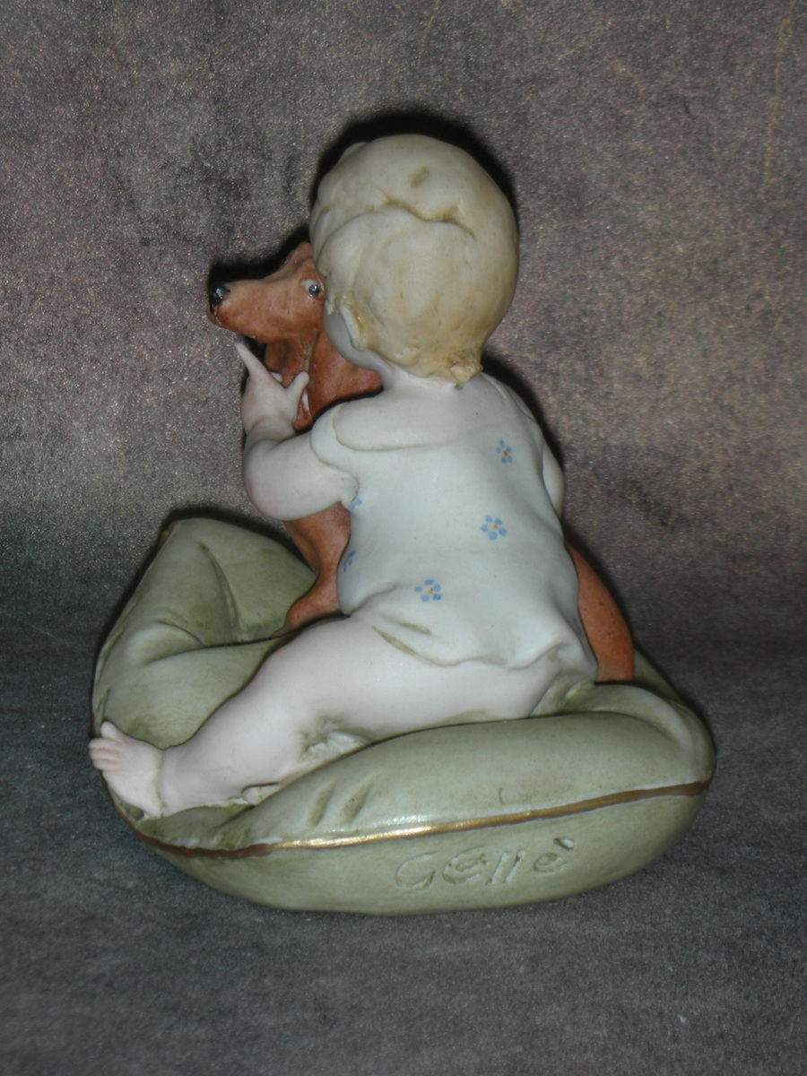 Фарфоровая статуэтка «Малыш с таксой на подушке», Италия (Capodimonte) /Giuseppe Cappe Gelle/ , Высота 8,5 см.